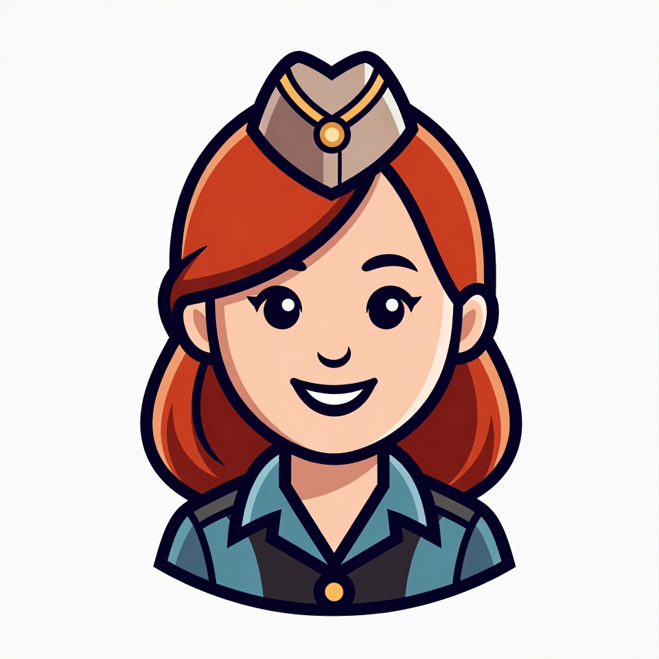 A cartoon illustration of a smiling woman with red hair styled in waves. She wears a blue flight attendant uniform with a gold-trimmed hat and vest. The image features her cheerful face on an isolated white background.