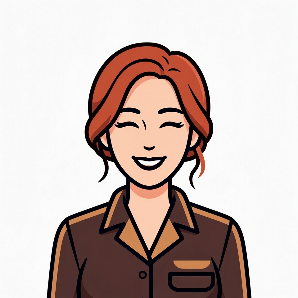 A cartoon illustration of a woman with red hair styled in a bun smiles happily with closed eyes. She wears a brown collared suit jacket with buttons and pockets. The image is isolated on a white background.