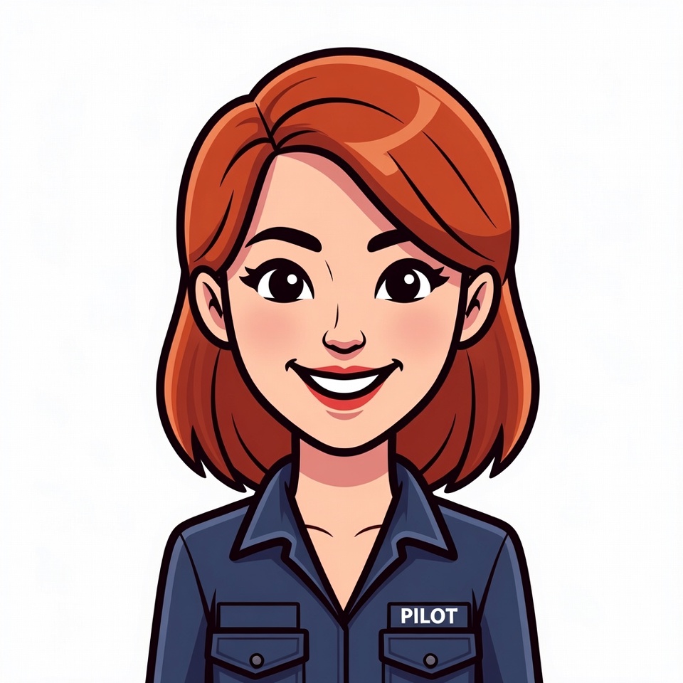 A cartoon illustration of a smiling woman with red bob haircut wearing a navy blue pilot uniform. She has large expressive eyes and a cheerful smile. The uniform features a 'PILOT' badge on the chest, set against a white background.