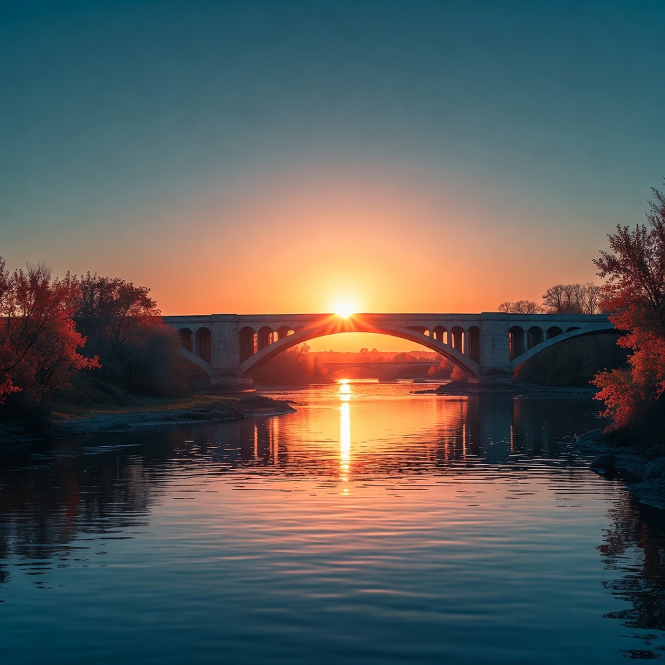 arch bridge, arched structure, autumn trees, calm water, clouds, dusk, evening, fall foliage, golden hour, horizon, landscape, nature, orange sky, outdoor, reflection, river, riverbank, scenery, serene, sky, sun, sunlight, sunset, tranquil, vibrant colors, water, bridge
