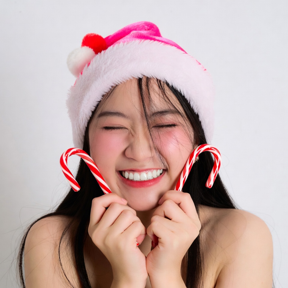 A young Asian woman with long black hair wears a pink Santa hat with white pom-pom and holds two red and white candy canes near her smiling face. She has closed eyes, rosy cheeks, and pink lips while grinning happily. The image is set against a plain white background.