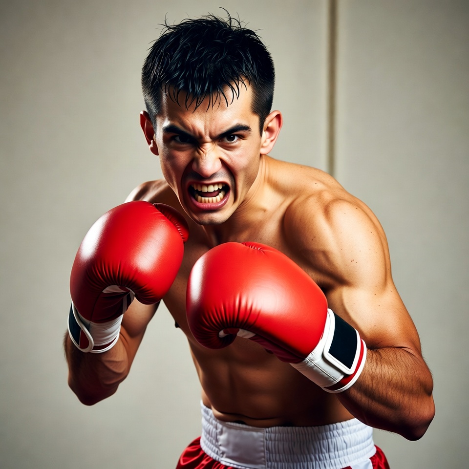 A muscular young man with short black hair stands in a boxing stance wearing red boxing gloves and red shorts with white trim. His upper body is bare, showcasing defined muscles, and he grimaces intensely with bared teeth. The background is a plain gray studio wall.