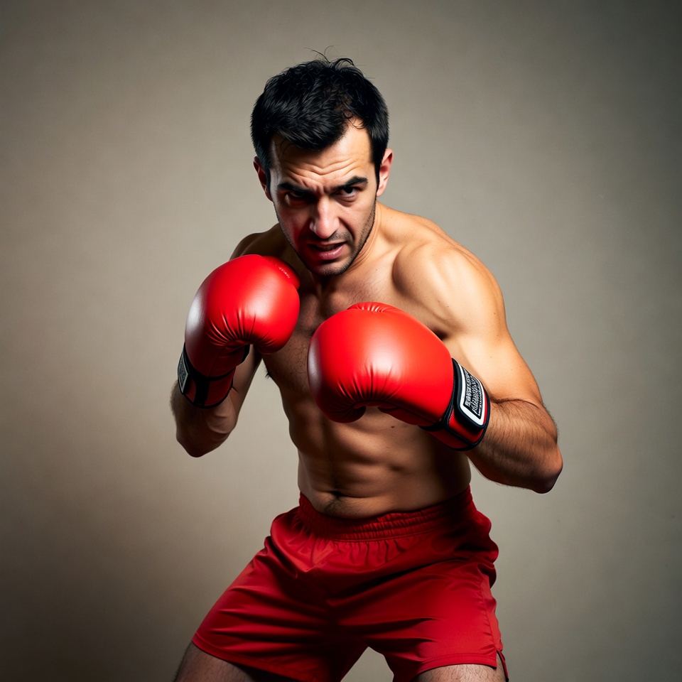 A muscular Middle Eastern man with short dark hair stands in a boxing stance on a beige background. He is shirtless, wearing red boxing gloves and red shorts, with a focused and intense expression on his face. His arms are raised in a defensive guard position.