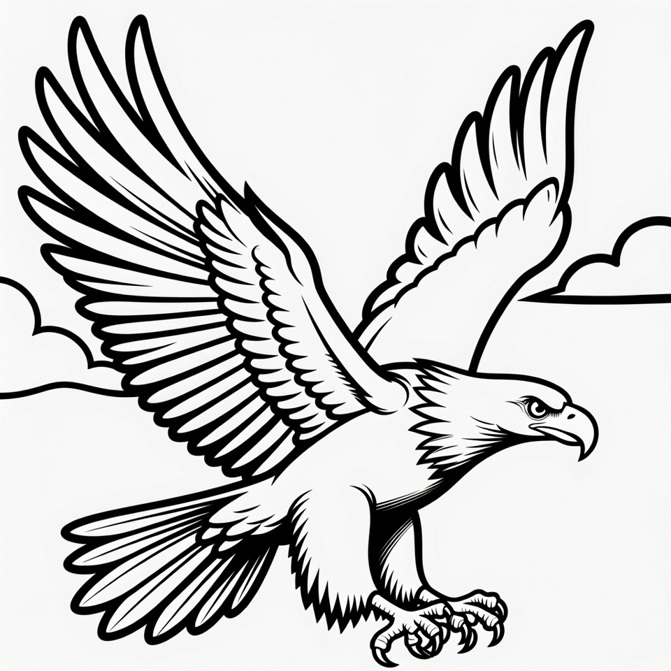 A detailed black and white line drawing of a bald eagle soaring with wings spread wide. The eagle has a fierce expression, sharp talons extended, and simple clouds in the background. It is rendered in a bold outline style on an isolated white background.