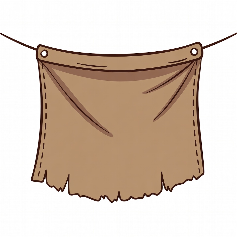 A blank brown cloth banner hangs from ropes on an isolated white background. The fabric has a ragged, torn edge and stitched details. It is illustrated in a simple cartoon style.