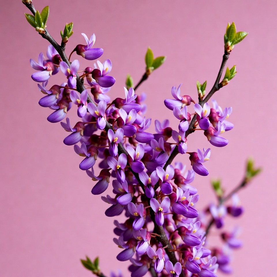 A cluster of vibrant purple wisteria flowers with pinkish pods hangs from thin branches adorned with fresh green leaves. The flowers are densely packed and displayed against a solid pink background. New buds and leaves add texture to the blooming branches.