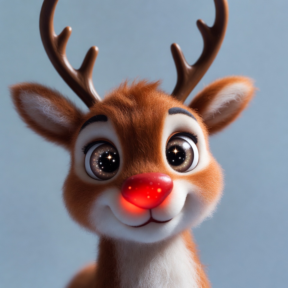 A cute cartoon reindeer with large sparkling eyes and a glowing red nose smiles at the viewer. It has brown fur, fluffy white underbelly, and large antlers. The reindeer is isolated on a blue background.