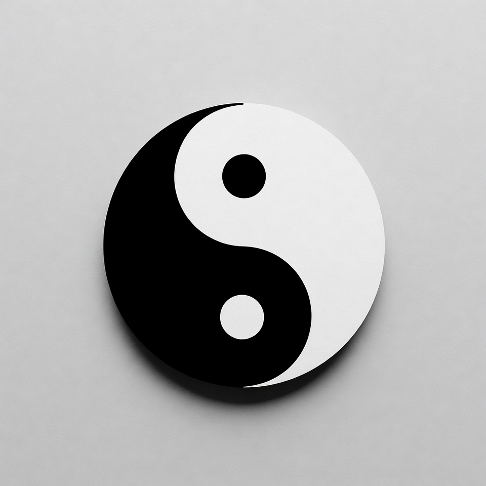 A classic black and white yin yang symbol is depicted on a circular background. The design features two interlocking teardrop shapes, one black with a white dot and one white with a black dot. It is rendered in a clean, 3D style against a light gray backdrop.