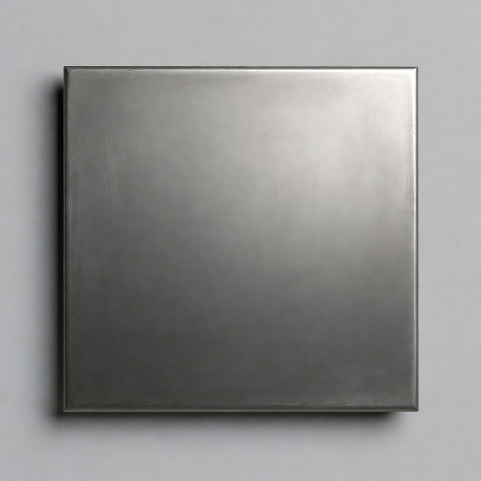 A square metallic plate with a brushed silver finish sits on a plain gray background. The surface shows subtle linear textures and slight reflections. It has sharp, clean edges and a polished appearance.