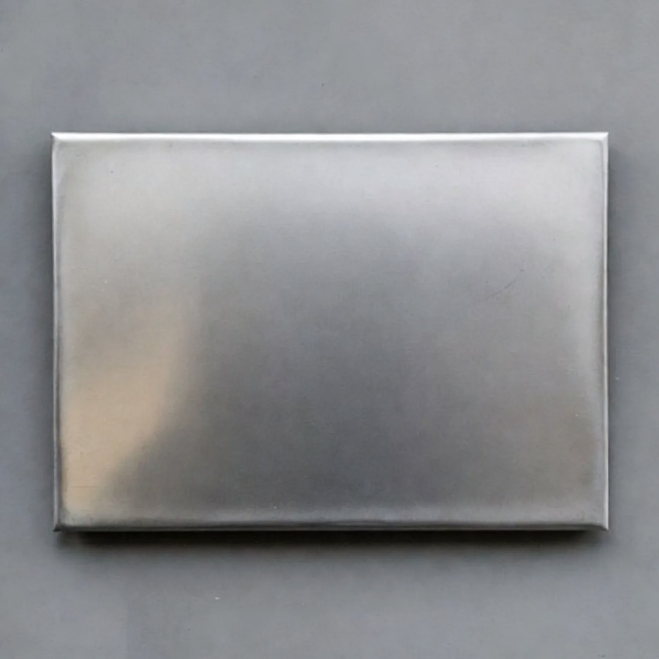 A rectangular silver metal plate with a highly reflective surface is shown against a gray background. The edges are straight and slightly beveled, giving it a modern industrial look. Subtle light reflections highlight its polished finish.