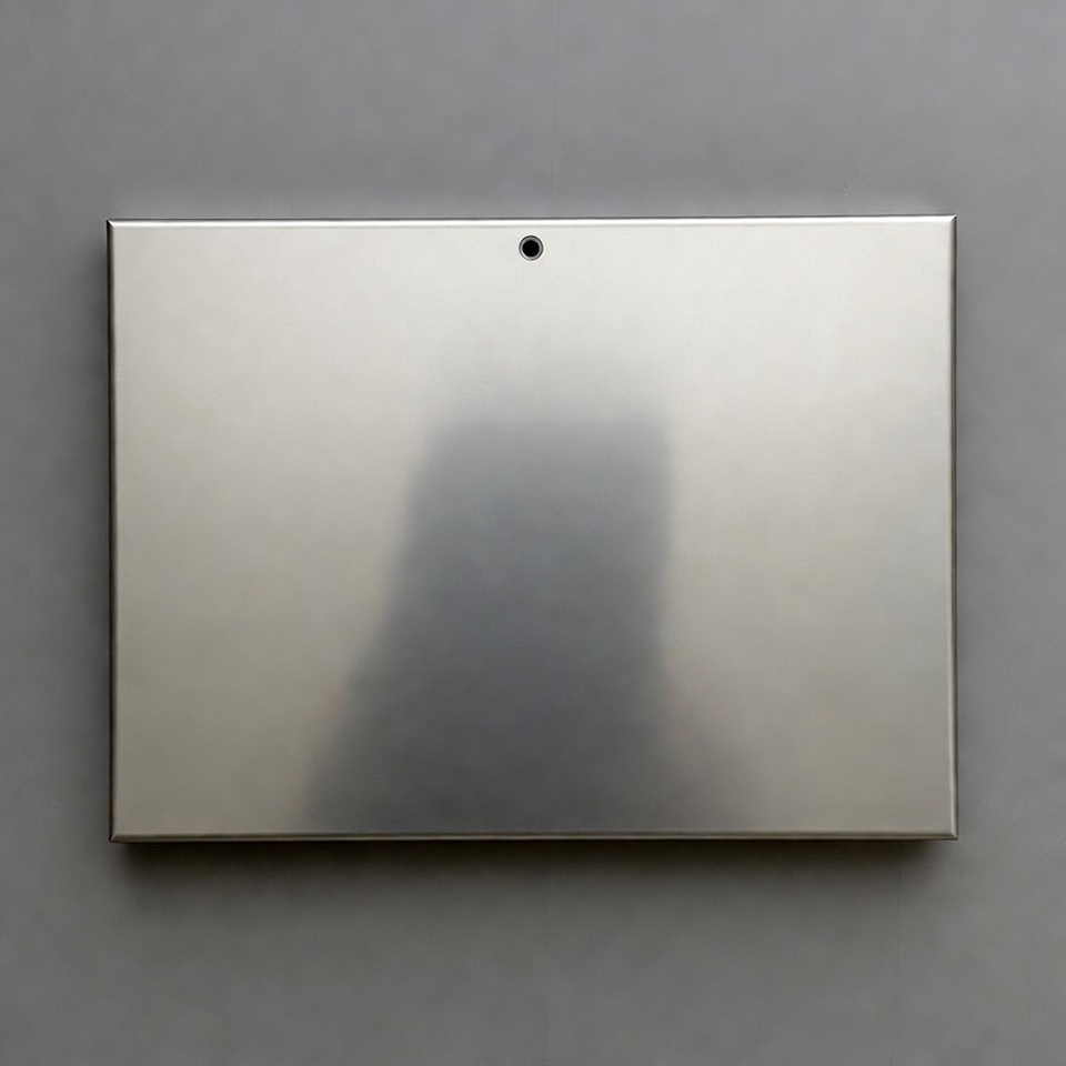 A rectangular silver metal plate with a polished surface is placed against a gray background. A dark vertical shadow falls across the center of the plate. A small hole is visible near the top edge.