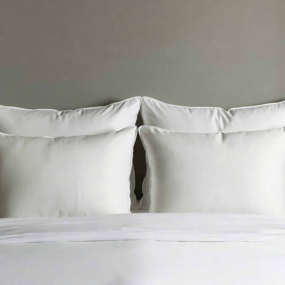 A neatly made bed features multiple white pillows stacked against a light gray headboard. The pillows are arranged in layers with crisp white pillowcases. The background wall is a soft gray tone.