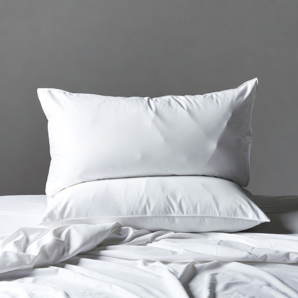 Two white pillows are stacked on a bed with rumpled white sheets. The pillows rest against a plain gray background. The scene features a clean, minimalist bedding arrangement.