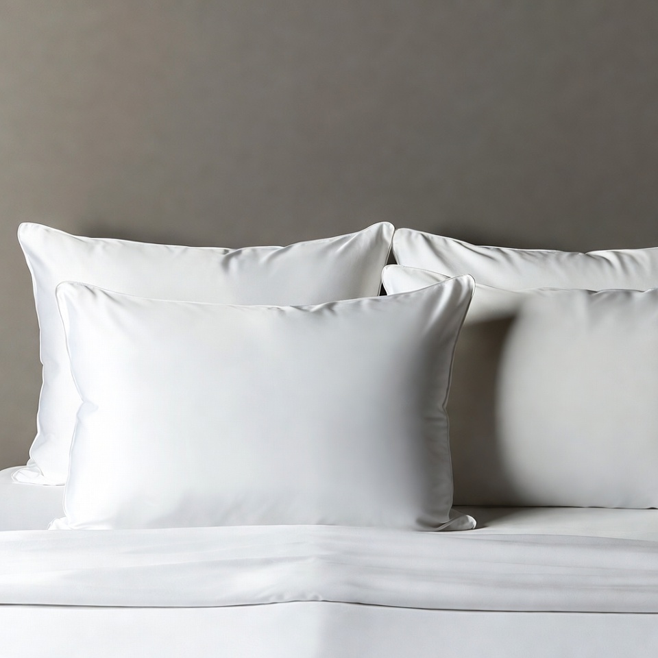 Several white pillows are stacked on a neatly made bed with white sheets. The pillows have smooth, silky cases and are arranged against a plain gray wall. The scene features a clean, minimalist bedroom setup.