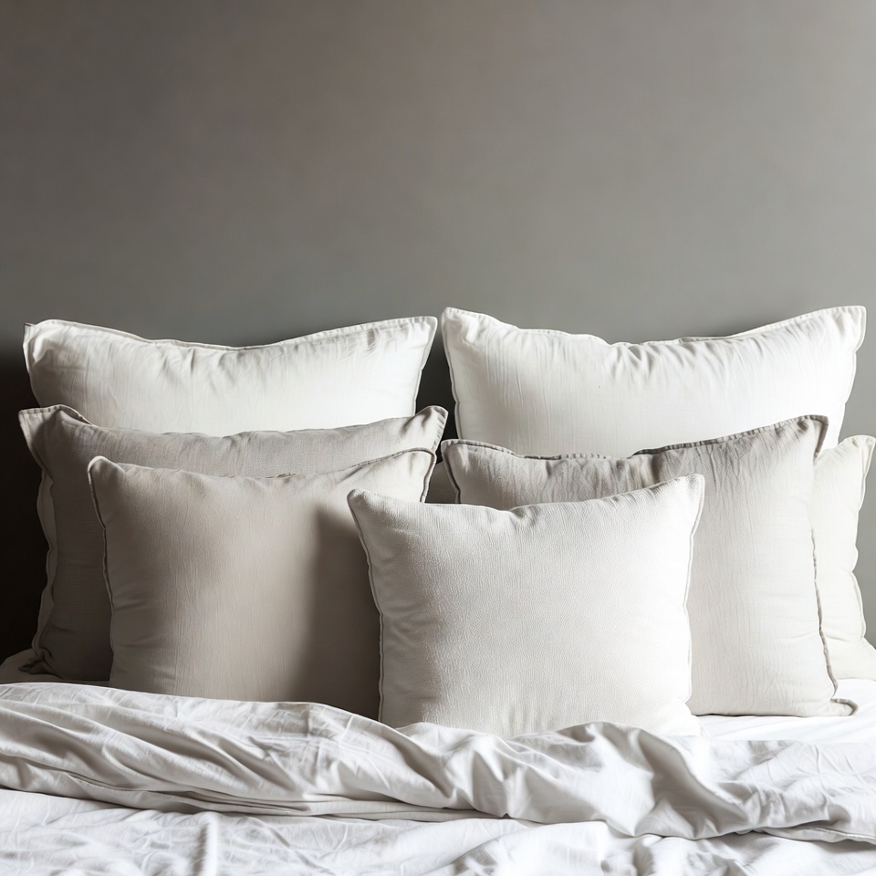 A stack of white and beige pillows in various sizes sits on a white bed against a gray wall. The pillows feature clean lines and subtle textures. The bed has smooth white sheets beneath the arrangement.