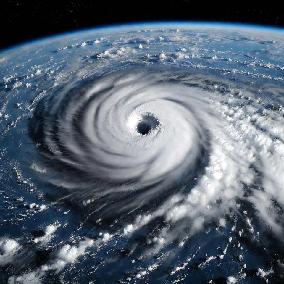 A powerful hurricane swirls over the Earth's atmosphere, viewed from space. The massive storm features a distinct eye at its center surrounded by thick white clouds and turbulent spiral bands. The blue planet's curvature and ocean surface are visible beneath the storm.