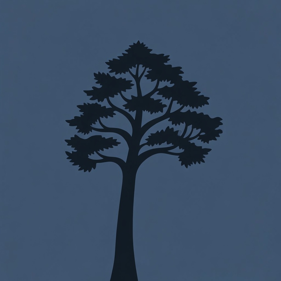 A black silhouette of a tall pine tree stands against a dark blue background. The tree features dense, triangular branches typical of a coniferous pine. The image is a simple vector illustration with no additional elements.