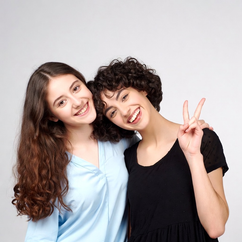 Two young women with curly hair stand close together against a white background, both smiling happily at the camera. The woman on the right has short curly hair, wears a black dress, and makes a peace sign with her hand over the shoulder of the woman on the left. The woman on the left has long wavy brown hair and wears a light blue v-neck top.