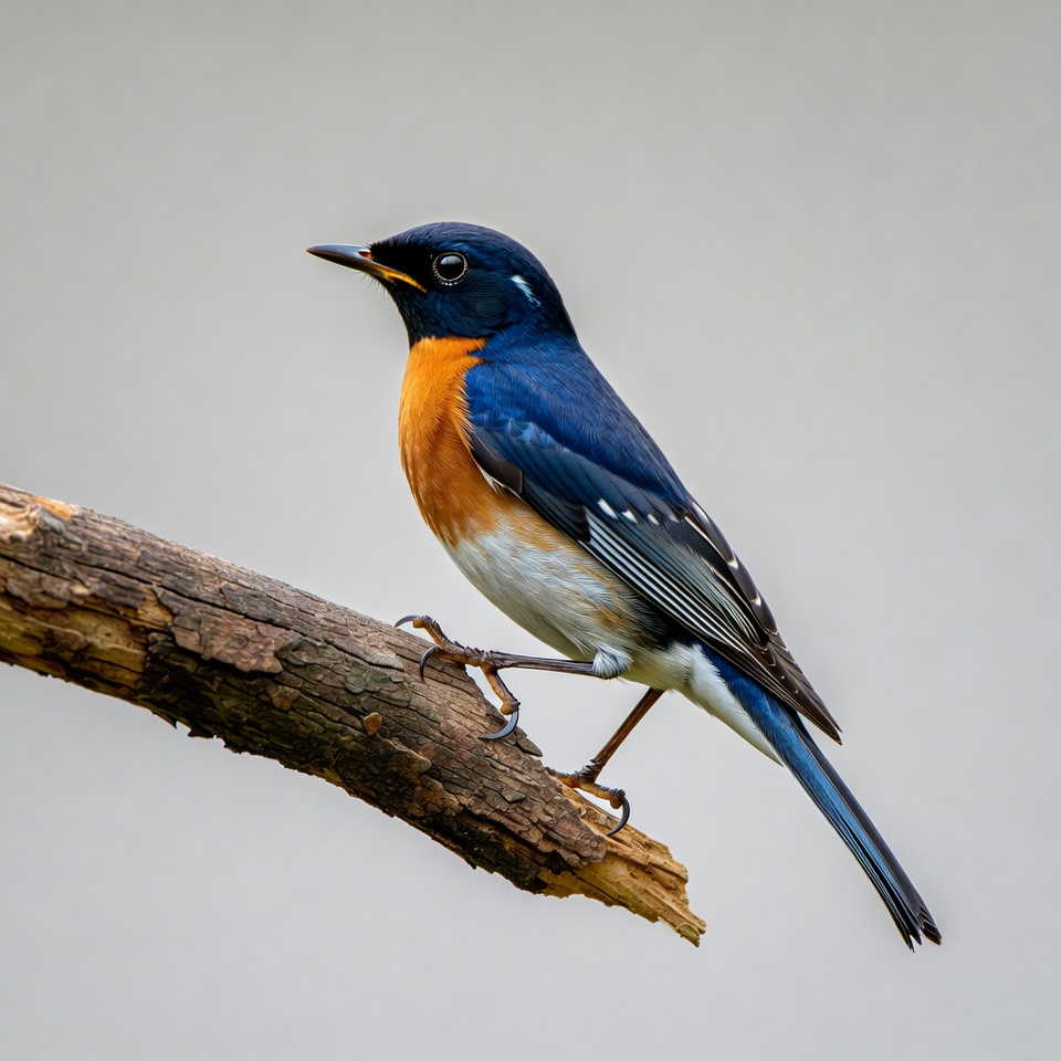 A vibrant redstart bird with blue upperparts, orange underparts, and white belly perches on a rough wooden branch. Its dark eyes and slender beak are prominent, with wings slightly spread. The bird stands against a plain light background.