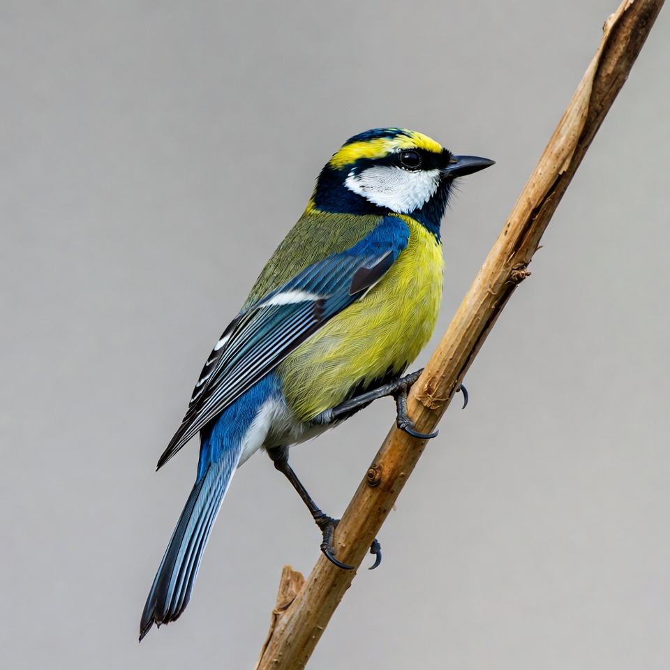 avian, bird, bird perched, black head, blue wings, branch, feathers, gray background, isolated, nature, small bird, songbird, tit bird, white cheek, wildlife, yellow bird, blue tit