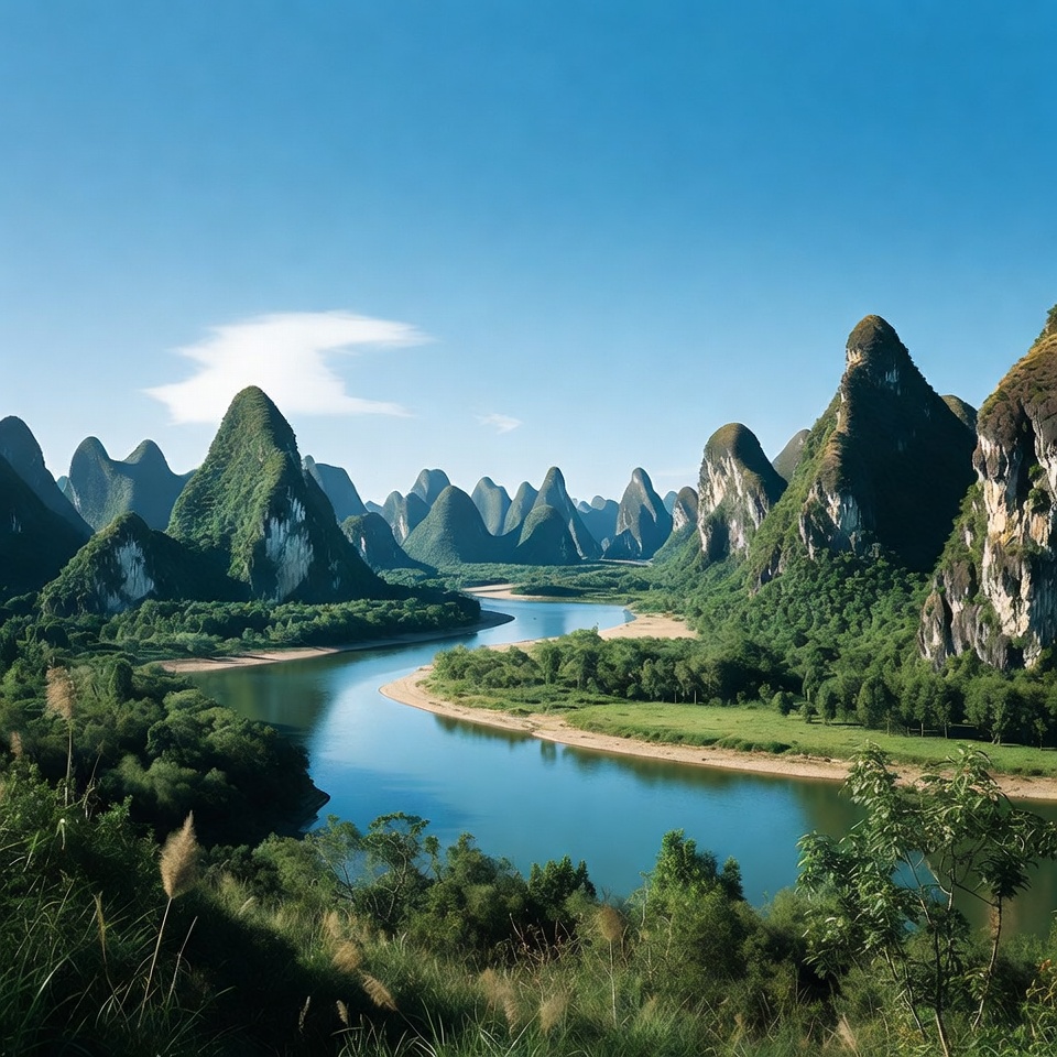 A serene river winds through dramatic karst peaks covered in lush green vegetation. Towering limestone mountains rise sharply from the landscape under a clear blue sky with scattered clouds. The scene features sandy riverbanks and dense surrounding forests.