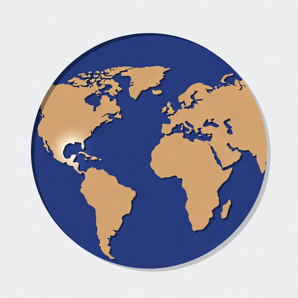 A blue globe illustration features a tan world map with California highlighted in white. The continents are outlined in tan against the deep blue oceanic background. It is isolated on a white background.