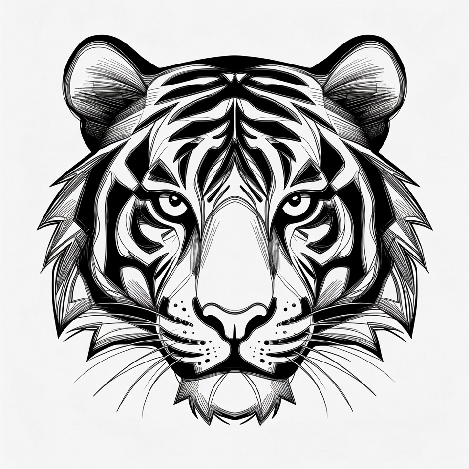 animal, black and white, detailed tiger, drawing, fierce eyes, illustration, ink art, isolated background, line art, roaring tiger, sketch, stripes, tiger face, tiger head, tribal tiger, vector art, whiskers, wild animal, tiger