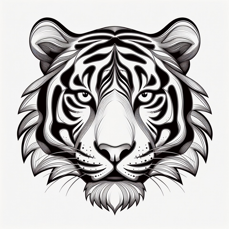 A black and white line art illustration features a tiger's face with intricate striped patterns. The tiger has fierce eyes, prominent whiskers, and detailed fur textures around the head. It is rendered in a realistic yet stylized vector style on a plain background.