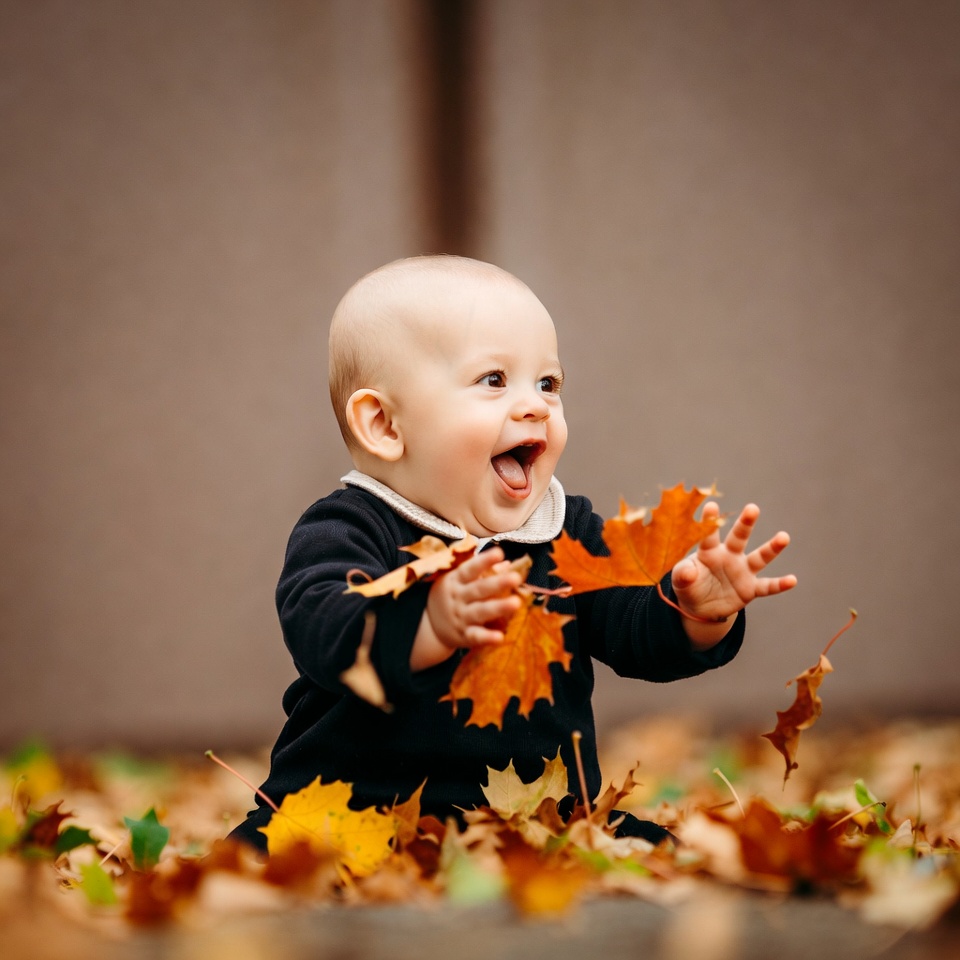 White, autumn baby, autumn leaves, baby hands, baby portrait, baby smiling, bald baby, blue eyes, boy, fall foliage, fall leaves, happy infant, holding leaves, infant, joyful baby, leaves pile, maple leaves, navy onesie, orange leaves, outdoor baby, smiling baby, toddler, white collar, yellow leaves, baby