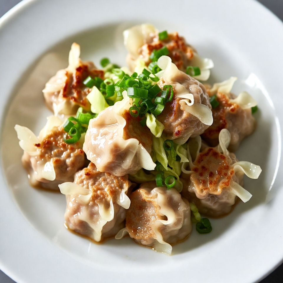 Asian cuisine, Chinese food, boiled dumplings, cabbage, closeup food, food photography, fresh herbs, garnished plate, green onions, pork dumplings, savory dish, scallions, steamed dumplings, white plate, dumplings