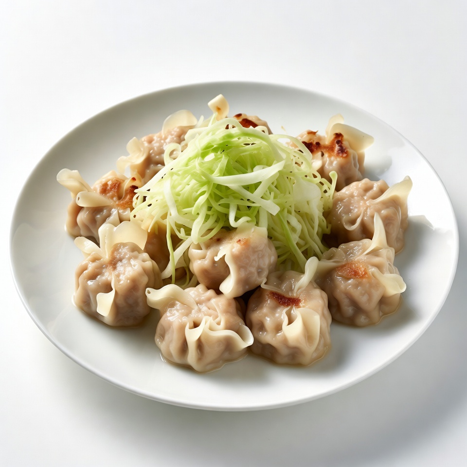 Asian food, Chinese dumplings, appetizers, cuisine, food, green onions, gyoza, isolated background, meal, potstickers, savory, scallions, shredded cabbage, steamed dumplings, top view, white plate, dumplings