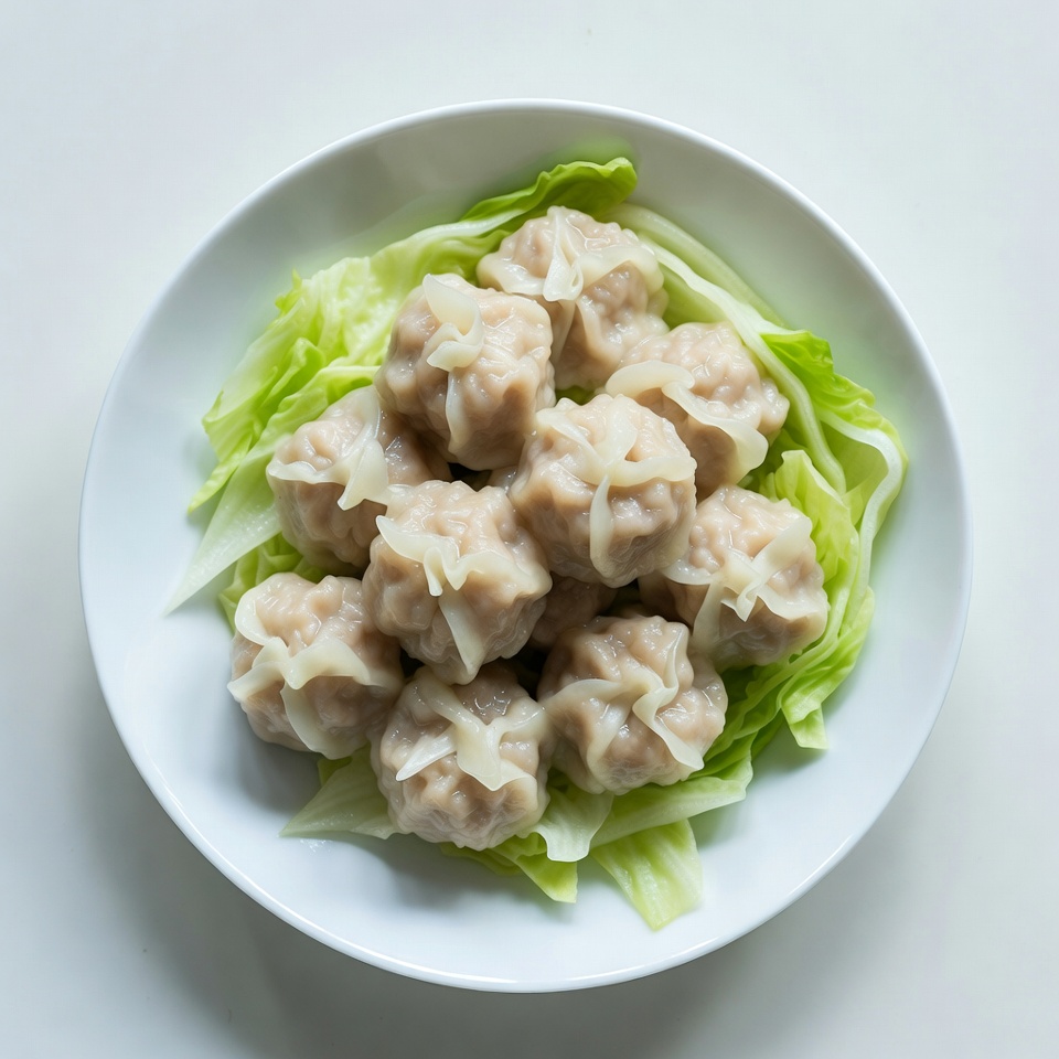 A white plate holds a cluster of steamed dumplings garnished with fresh green lettuce leaves. The dumplings are pale beige with subtle folds and arranged in a circular pattern. The image is captured from a top-down view on a plain white background.
