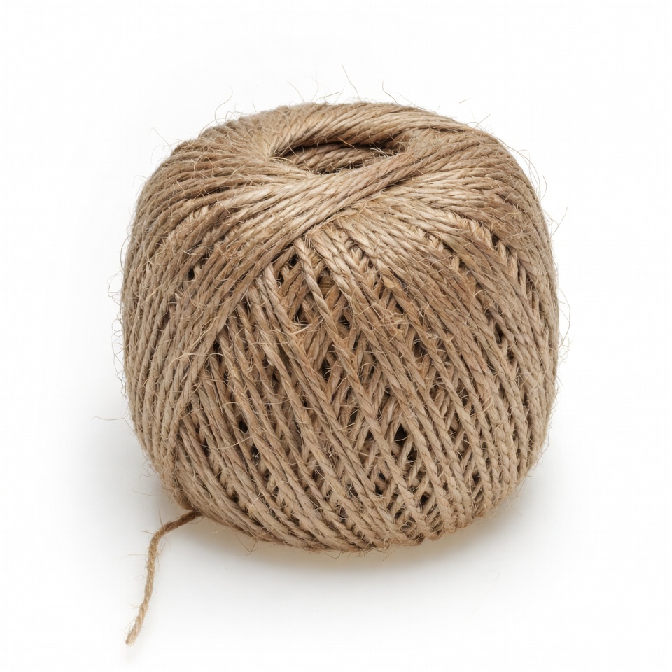 A round ball of natural brown twine sits on a plain white background. The twine is tightly wound with fibers visible on the surface. A single strand of twine trails from the ball.