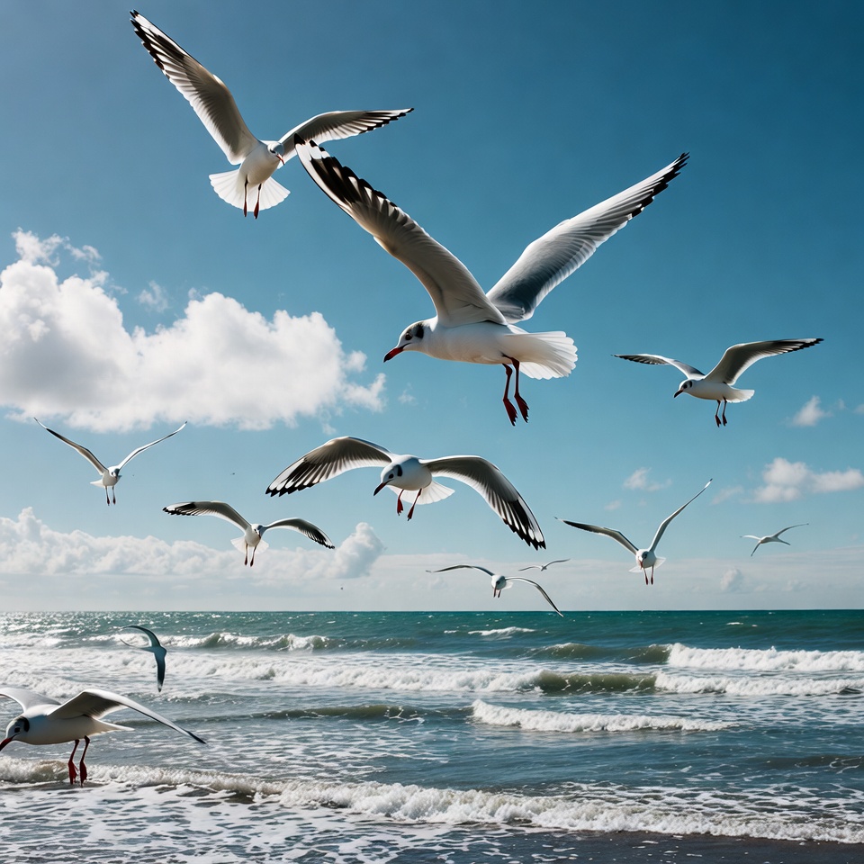 A flock of white seagulls with black-tipped wings soars through a bright blue sky dotted with clouds. Below them, gentle waves crash onto a sandy beach. The birds are captured mid-flight with outstretched wings against the ocean backdrop.