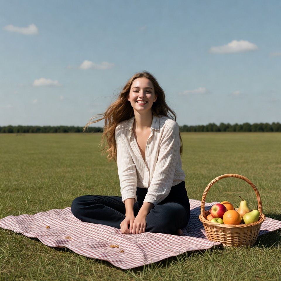 White, apples, blue sky, checkered blanket, clouds, cross-legged, female, fresh fruit, fruit basket, grass, green field, long hair, oranges, outdoor, pants, pears, picnic, red blanket, sitting, smiling, wavy hair, white shirt, wicker basket, young woman, woman