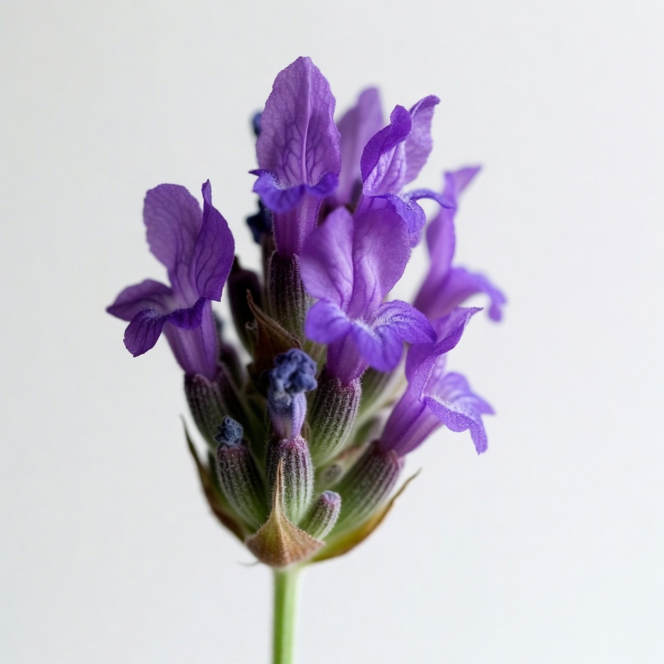 A cluster of vibrant purple lavender flowers stands against a white background. The blooms feature delicate purple petals and green stems with small buds. The image captures fine details of the flower spikes in sharp focus.