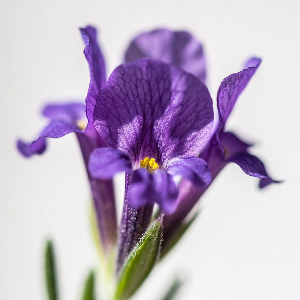 bloom, botany, closeup, floral, flower cluster, flower macro, garden flower, green stems, isolated background, nature, petals, purple flowers, veined petals, vibrant purple, yellow center, iris flower