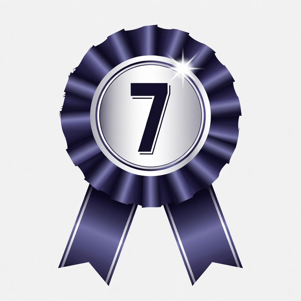 award, badge, blue ribbon, clipart, competition, illustration, isolated background, medal, metallic, navy blue, number 7, prize, ribbon, seventh place, shiny, silver circle, starburst, trophy, winner, 7th place