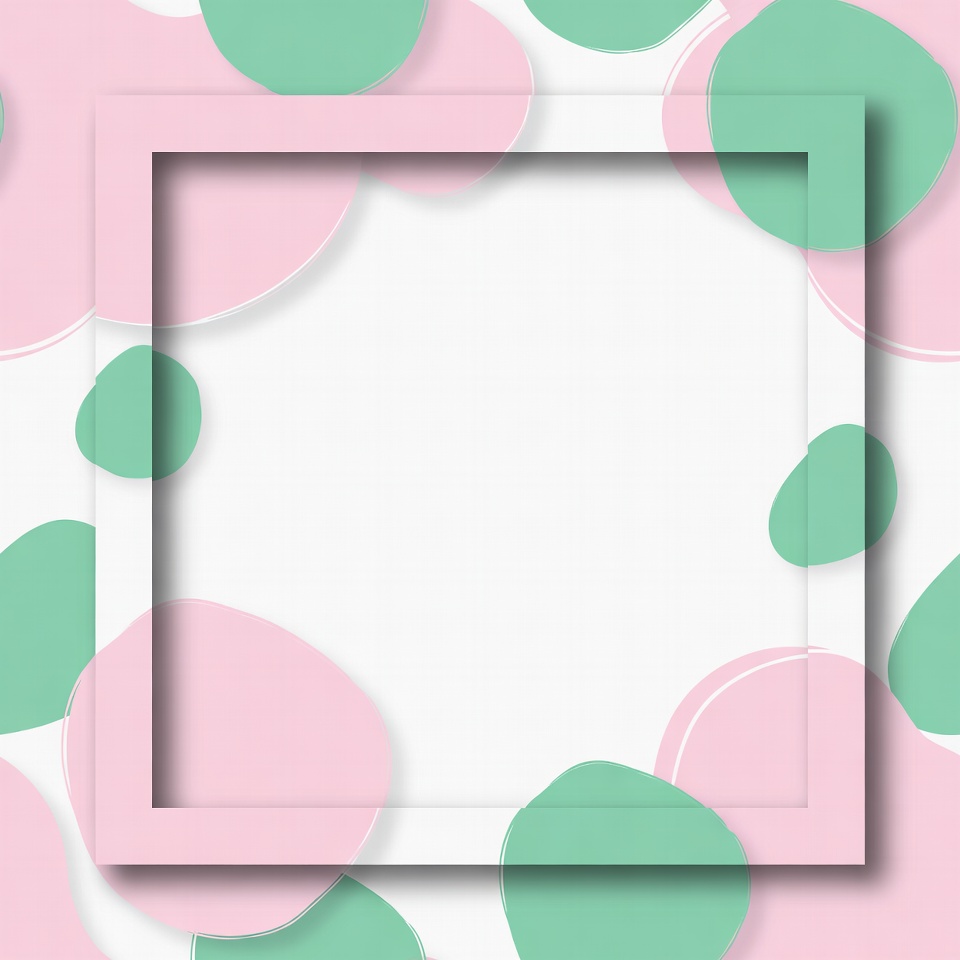 A white square frame sits on a vibrant background of overlapping pink and green bubbles. The bubbles have soft, rounded edges and create a playful, abstract pattern. The design features an isolated white space in the center, ideal for overlays.