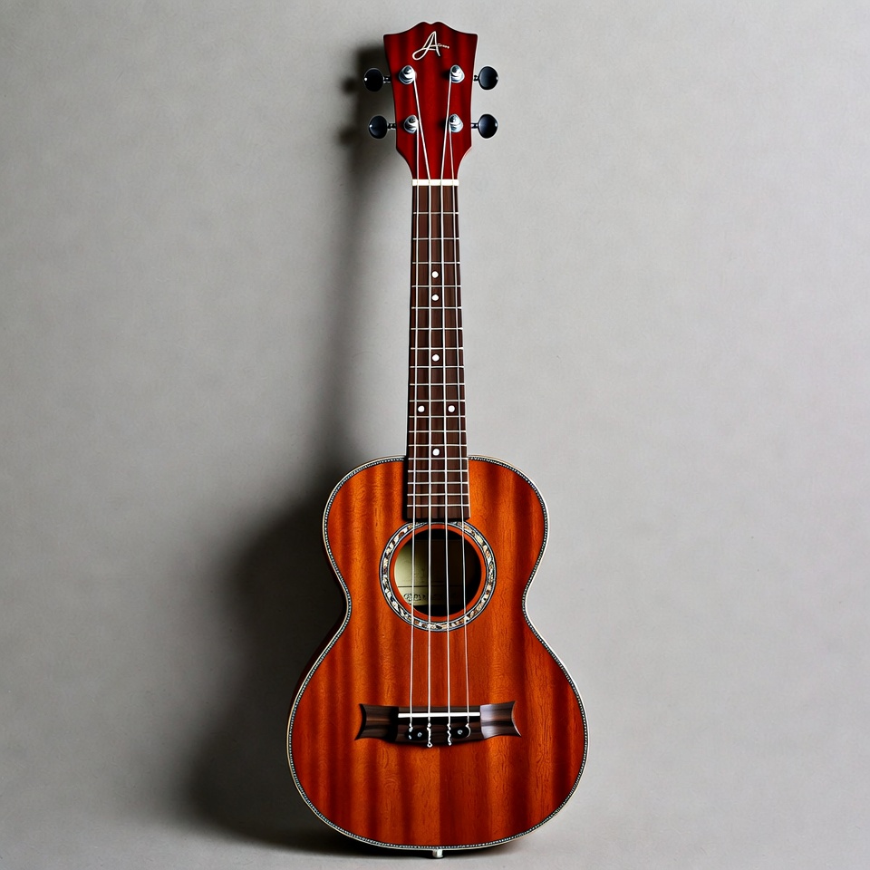 acoustic ukulele, glossy finish, isolated background, musical gear, musical instrument, nylon strings, red headstock, red ukulele, soprano ukulele, sound hole, string instrument, tuning pegs, wood grain, wooden ukulele, ukulele
