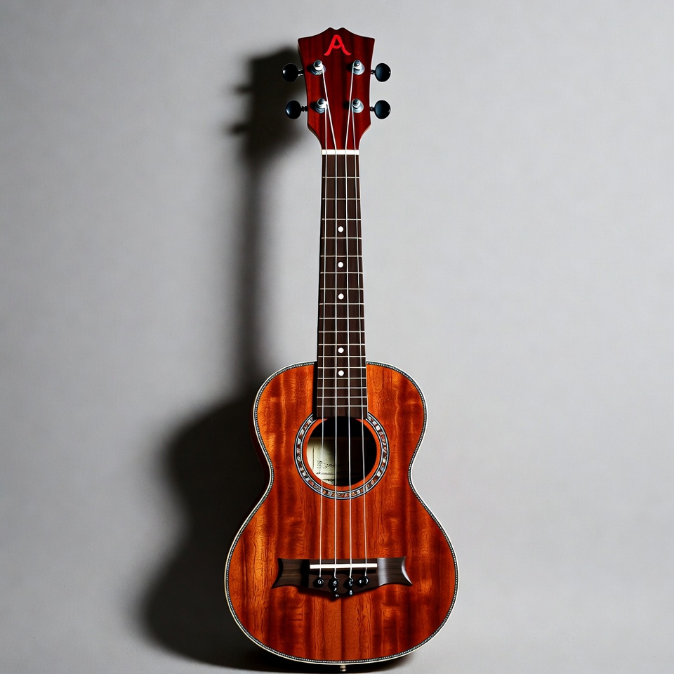 A logo, acoustic ukulele, bridge, frets, glossy finish, headstock, isolated background, koa wood, musical instrument, red ukulele, soprano ukulele, sound hole, string instrument, strings, tuning pegs, wood ukulele, ukulele