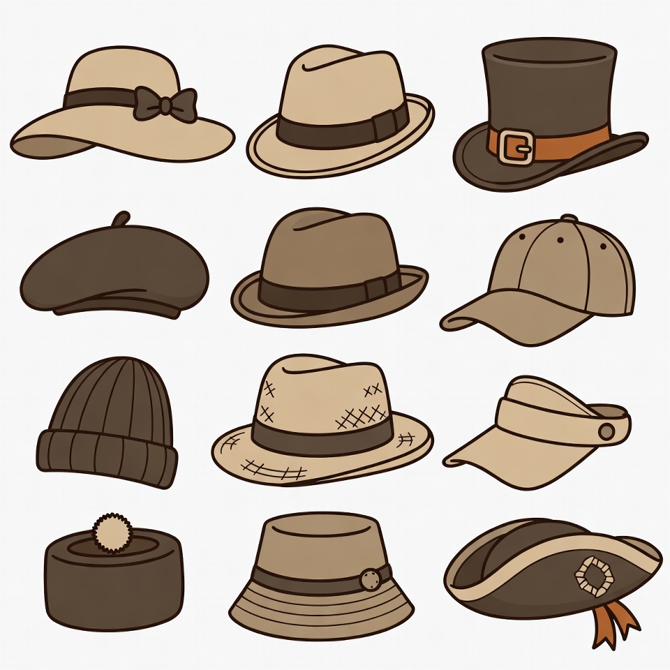baseball cap, beanie, beret, bow hat, brown hats, bucket hat, clipart, embroidered hat, fashion, fedora, headwear, illustration, isolated background, knit hat, pom pom hat, sun hat, top hat, vintage hats, visor, hats