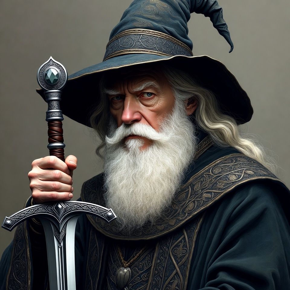 White, black hat, dark robes, digital art, elderly wizard, embroidered robes, fantasy character, fantasy sword, gem pommel, gripping sword, illustration, long hair, mage, magic, male, old man, ornate sword, pointed hat, robes, sword, white beard, wizard