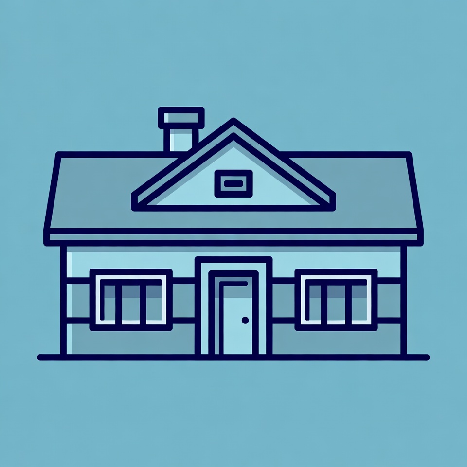 A simple line drawing illustration of a house with a sloped roof, chimney, front door, and multiple windows. The house features light blue shading on a solid blue background. It has a classic rectangular shape with horizontal siding.