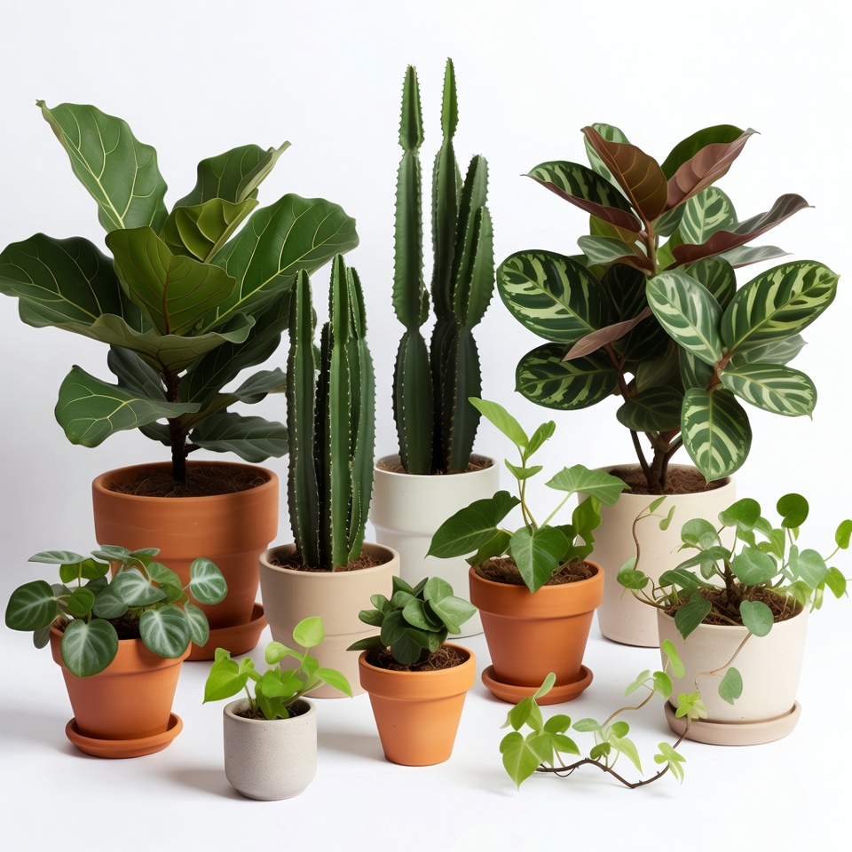 A diverse collection of houseplants in various pots is arranged on a white background. The plants include large fiddle leaf figs, tall cacti, colorful calatheas with striped leaves, and small trailing vines. Different pot styles such as terracotta, white ceramic, and gray containers hold the greenery.