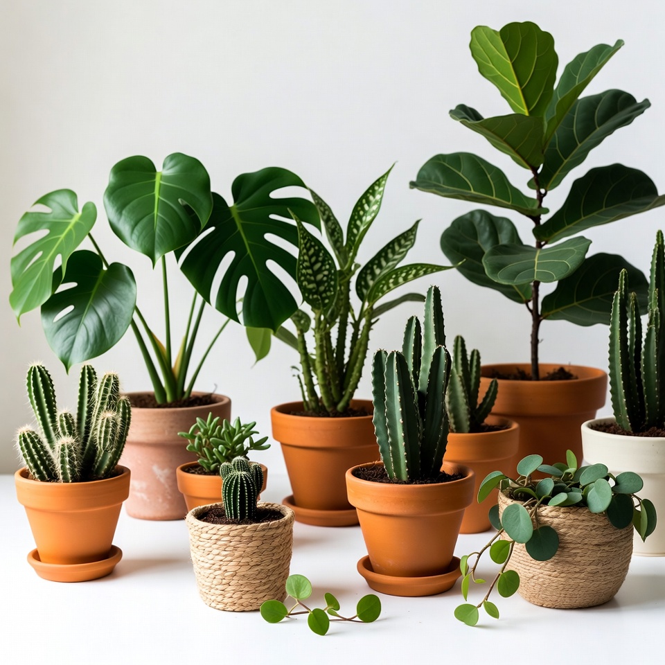 A diverse collection of indoor plants in terracotta and white pots is arranged on a plain white surface. The group includes large monstera leaves, fiddle leaf figs, spiky cacti, succulents, and trailing vines. Various green foliage types create a lush, clustered display.