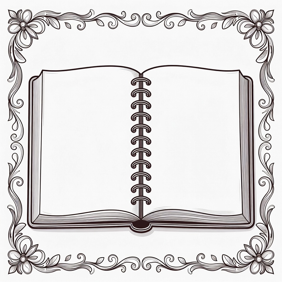binder, blank notebook, blank pages, clipart, decorative border, doodle, empty notebook, floral frame, illustration, isolated background, journal, line art, notebook illustration, open book, ornate frame, sketch, spiral notebook, vector art, white background, open notebook