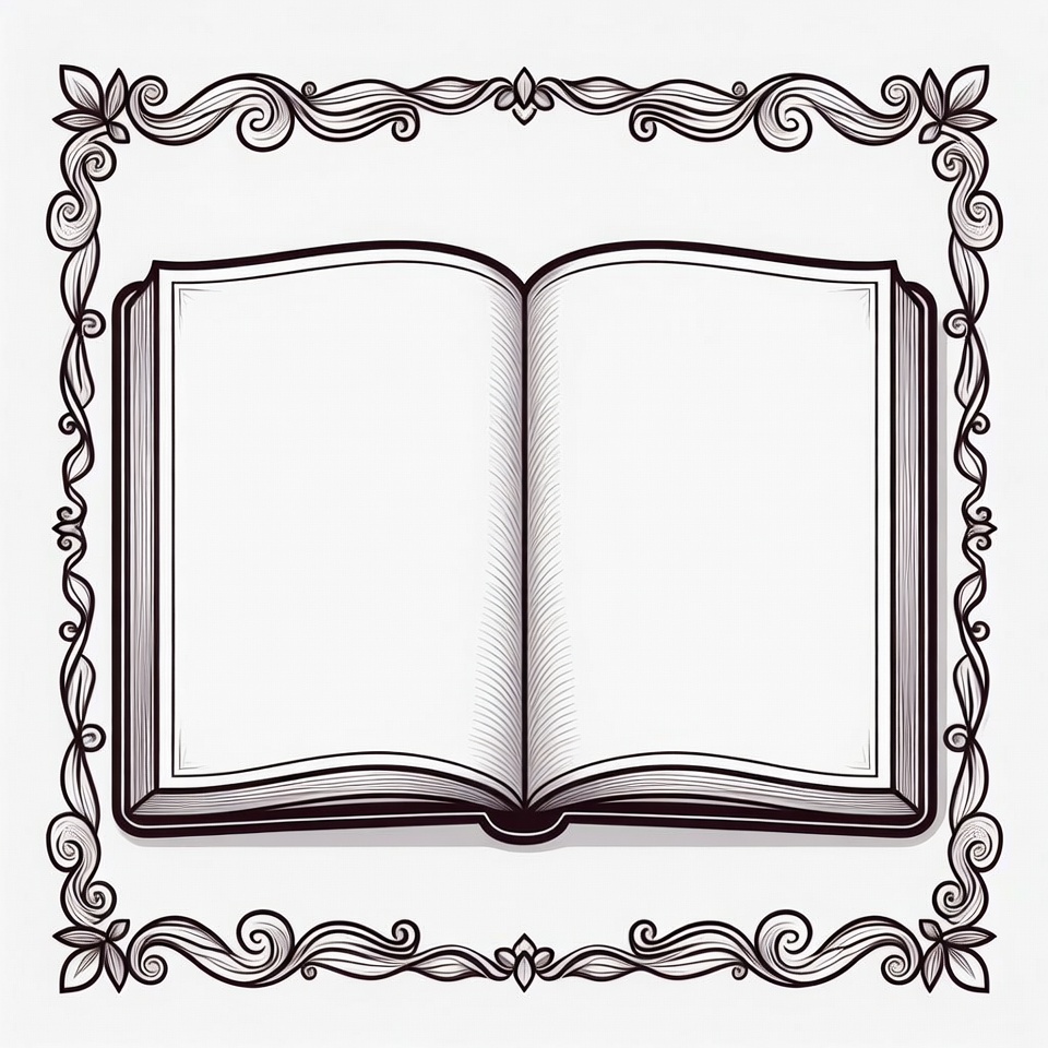 blank book, book illustration, clipart, decorative border, empty pages, floral border, illustration, isolated background, leaves design, line art, ornate frame, sketch book, swirling vines, vintage frame, open book