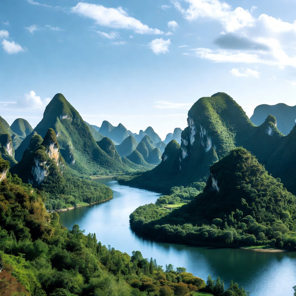 Towering green karst mountains surround a winding turquoise river in a lush valley. The landscape features sharp rocky peaks covered in dense vegetation and scattered clouds in a clear blue sky. The serene scene showcases layered hills and reflective water.