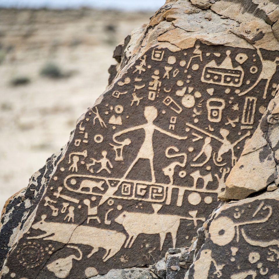 A large rock slab in the desert features numerous ancient petroglyphs carved into its surface. The white line drawings depict stick-figure humans in various poses, along with animals such as goats, cattle, and snakes. Symbolic shapes and patterns surround the figures against a sandy, arid background.